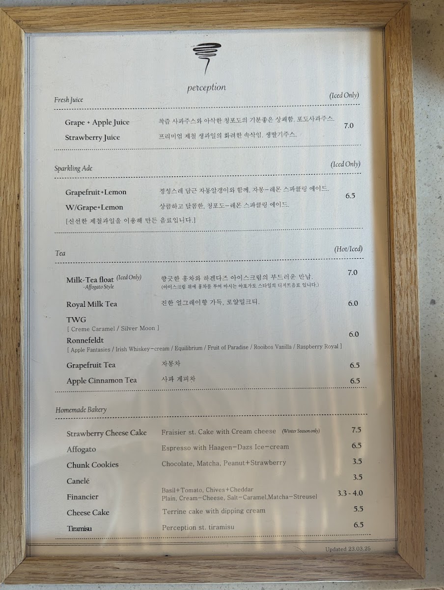 Experience the artistry of coffee and dessert at Perception, where every visit promises satisfaction and a taste of Seoul's vibrant cafe culture.